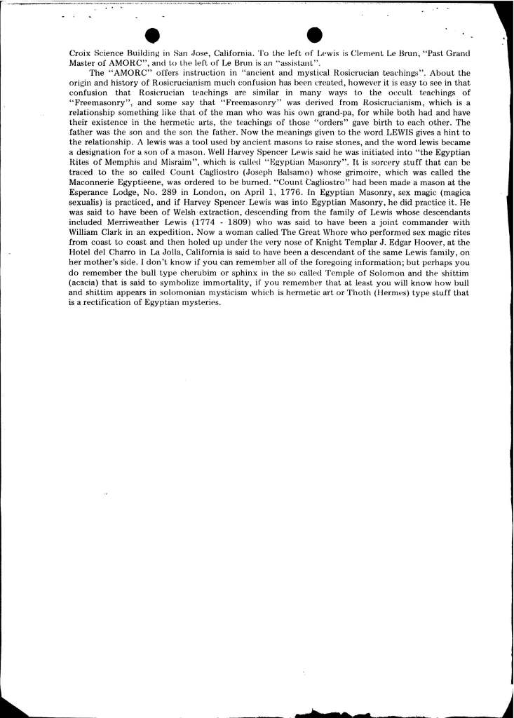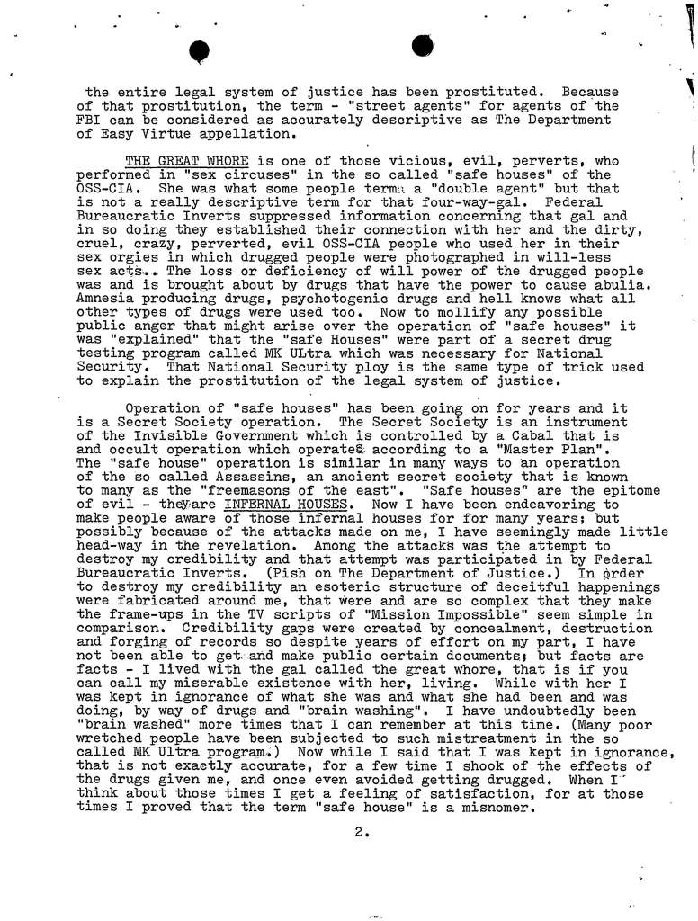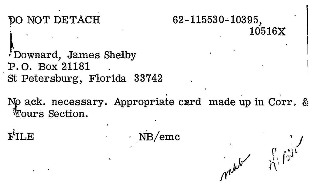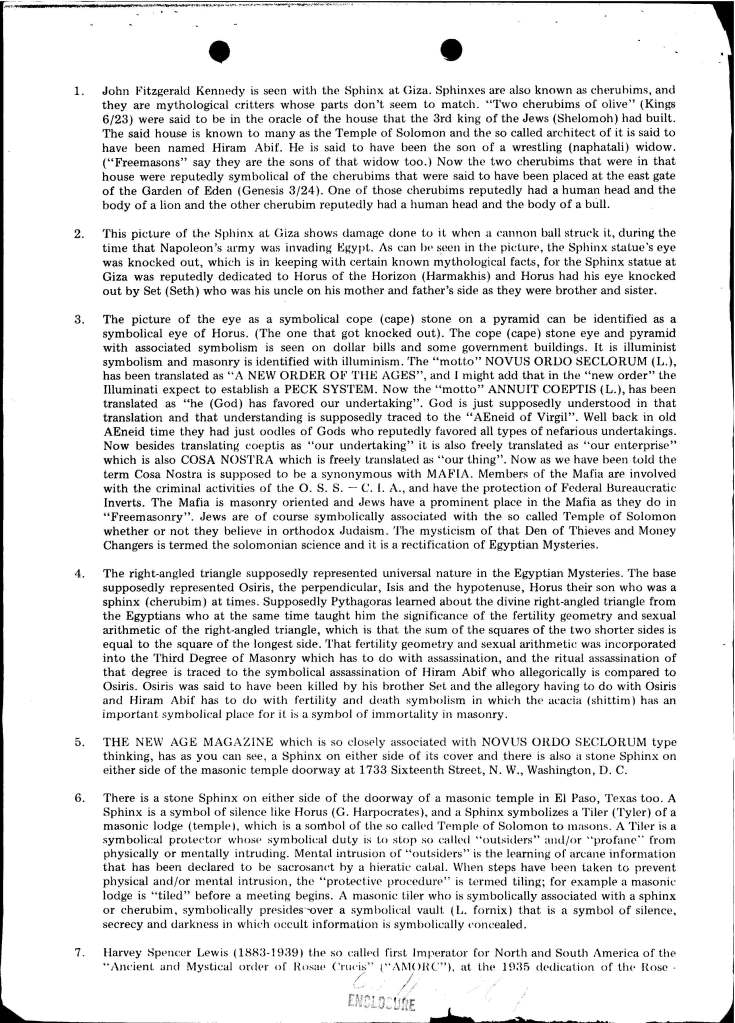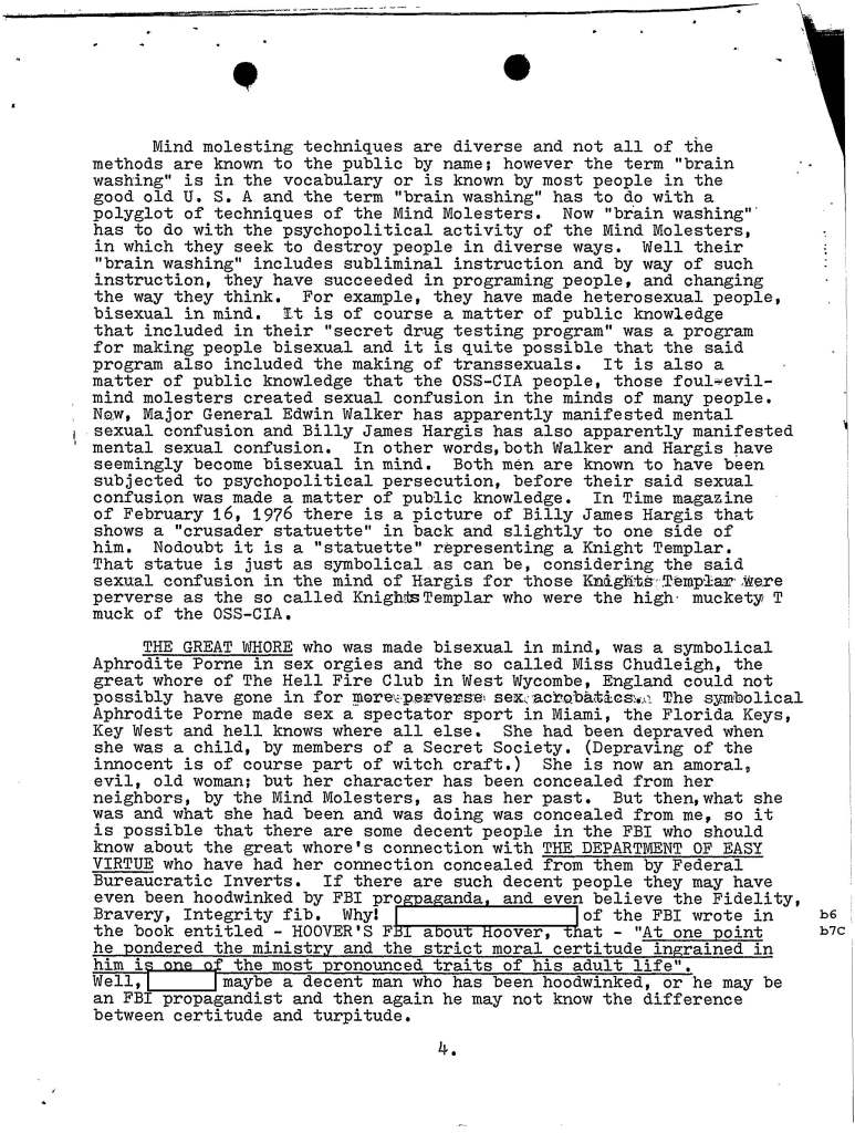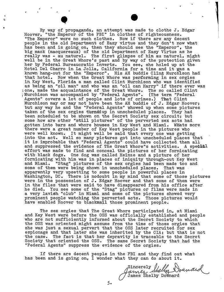 A couple years back when I was conducting background research for Stalking the Great Whore: The Lost Writings of James Shelby Downard, my pal Jack Brewer (of the UFO Trail and Expanding Frontiers Research) was gracious enough to file a FOIA request for me with the FBI (otherwise known to Downard as the Federal Bureaucratic Inverts), and the result of said request netted the following document, which in essence was a rambling 9 page diatribe Downard sent to then FBI Director Clarence Kelley (who was probably wondering “wtf is this shit?”) concerning a manuscript Downard had just completed writing called Sorcery, Sex, Assassination and the Science of Symbolism.